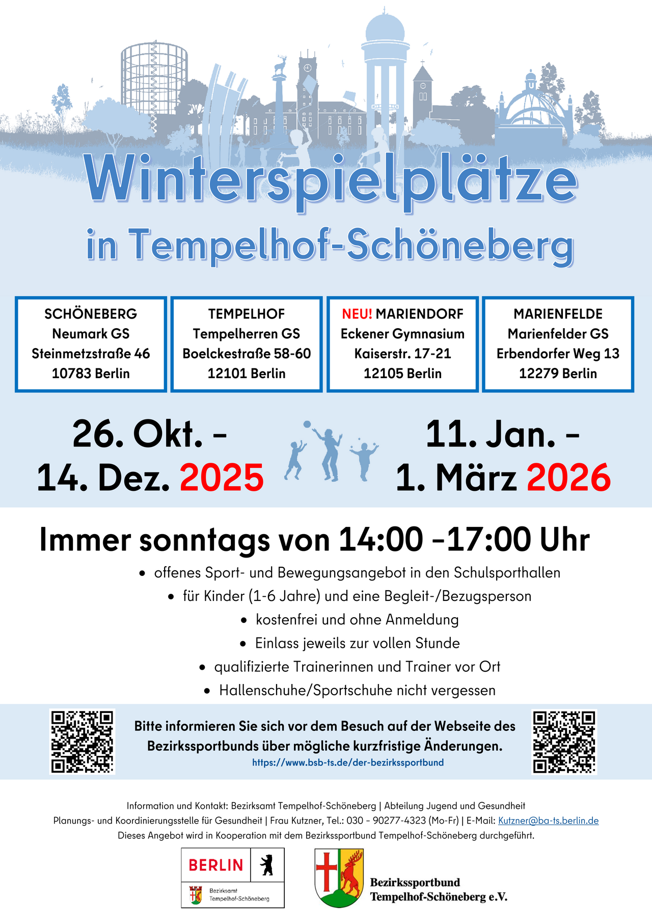 Die Winterspielplätze sind vom 26.10.2025 bis 14.12.2025 und im nächsten Jahr vom 11.01.2026 – 01.03.2026 jeweils sonntags von 14–17 Uhr geöffnet und werden in allen Hallen vom Bezirkssportbund umgesetzt.